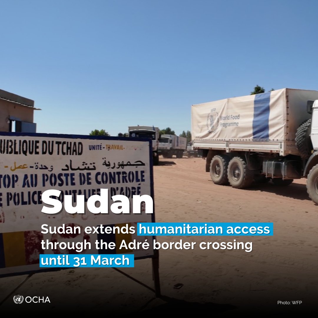 أعرب مكتب الأمم المتحدة لتنسيق الشؤون الإنسانية في السودان (أوتشا) عن ترحيبه بقرار السلطات السودانية تمديد فترة الوصول الإنساني عبر معبر أدري الحدودي مع تشاد لمدة ثلاثة أشهر إضافية، حتى 31 مارس/آذار المقبل.