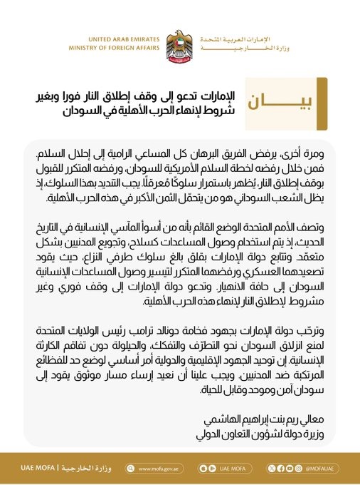 وأضافت أن دولة الإمارات تتابع بقلق بالغ سلوك طرفي النزاع، إذ يسهم تصعيدهما العسكري ورفضهما تسهيل وصول الإغاثة في دفع البلاد نحو حافة الانهيار، مؤكدة أن الإمارات تدعو إلى وقف فوري وغير مشروط لإطلاق النار لإنهاء الحرب الأهلية.