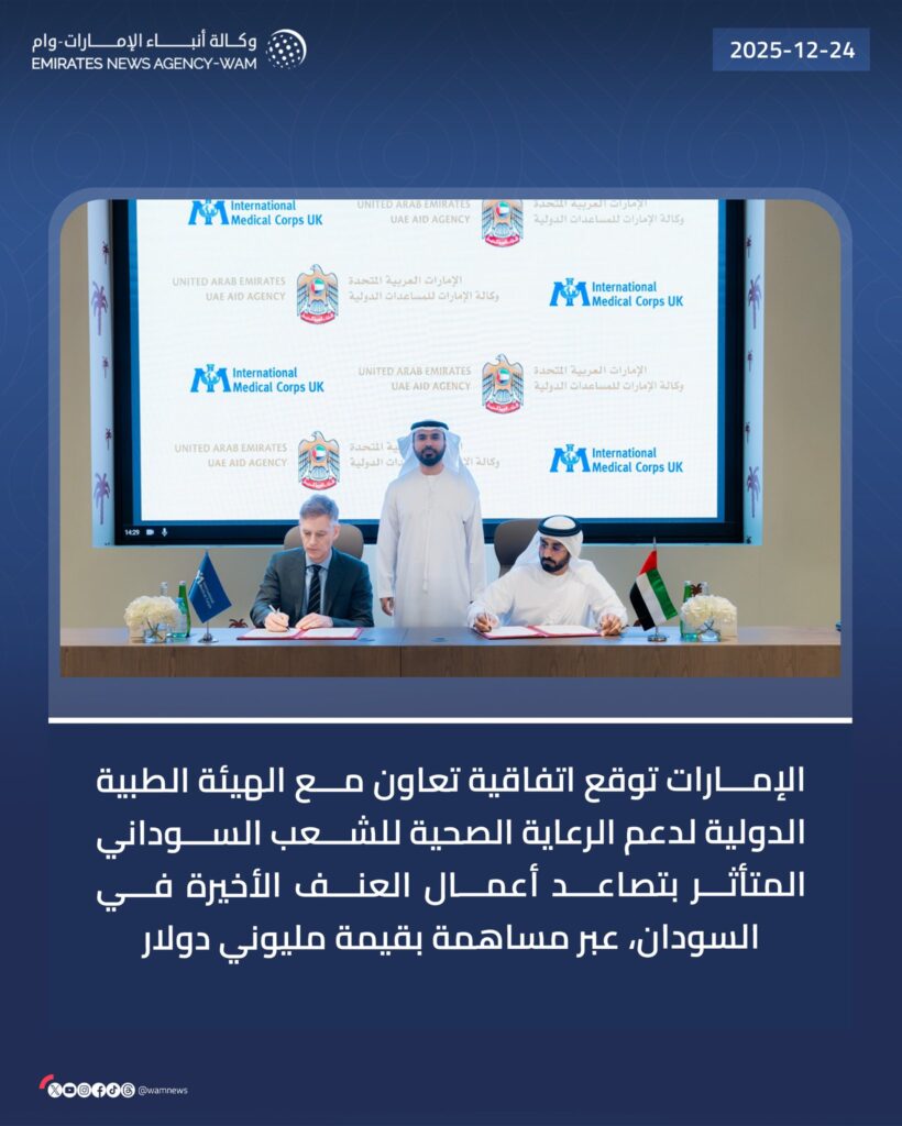 وقعت الإمارات اتفاقية تعاون مع الهيئة الطبية الدولية لتقديم مساعدة بقيمة مليوني دولار لدعم الرعاية الصحية للشعب السوداني المتأثر بتصاعد أعمال العنف. المساهمة تهدف إلى تعزيز التدخل الطبي العاجل وتلبية الاحتياجات الصحية في المناطق الأكثر تضرراً.