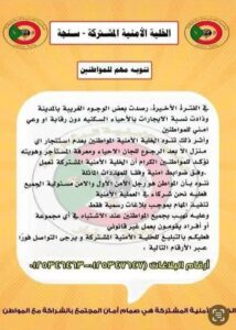 وأكدت الخلية الأمنية أنها ستتخذ إجراءات قانونية صارمة تجاه أي مخالفات أو أنشطة غير مشروعة قد تهدد استقرار المدينة، مشددة على ضرورة تعاون المواطنين مع السلطات المحلية في رصد أي تحركات أو ظواهر مريبة حفاظًا على أمن سنجة وسلامة سكانها.