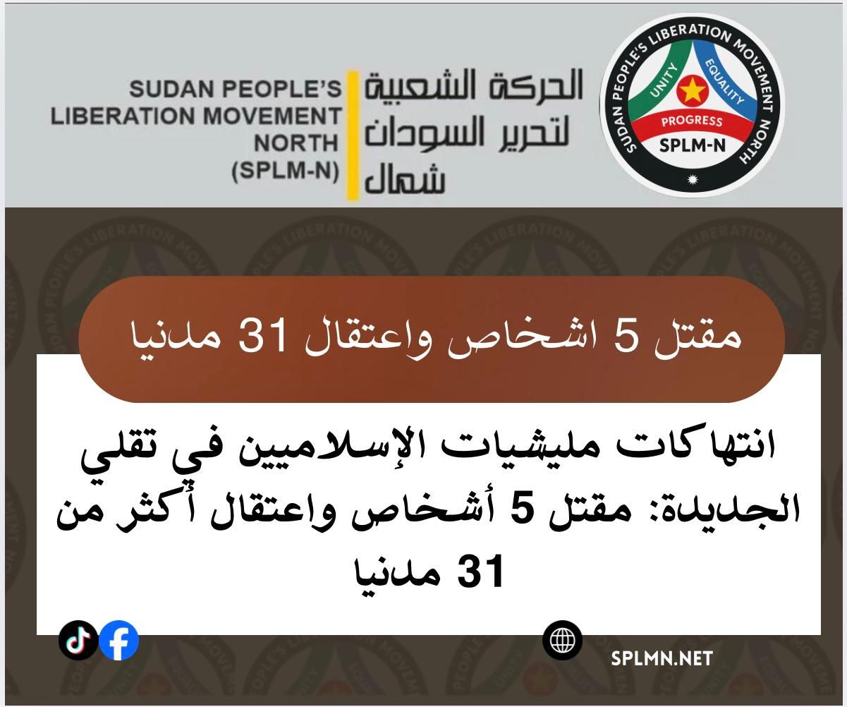 يقبع ما لا يقل عن 31 مواطنًا من المدنيين من مقاطعة تقلي الجديدة في معتقلات مليشيات ما يُعرف بالقوات المسلحة التابعة للحركة الإسلامية، وذلك منذ الهجمات والاعتداءات المسلحة التي استهدفت المدنيين في المنطقة ابتداءً من التاسع عشر من فبراير الماضي.