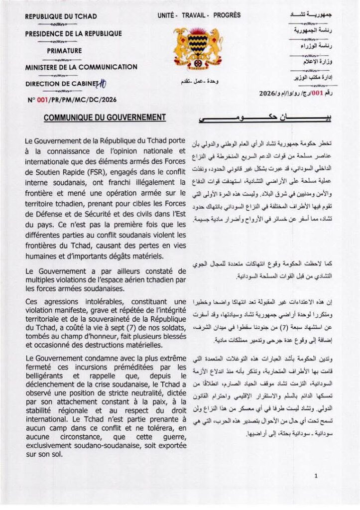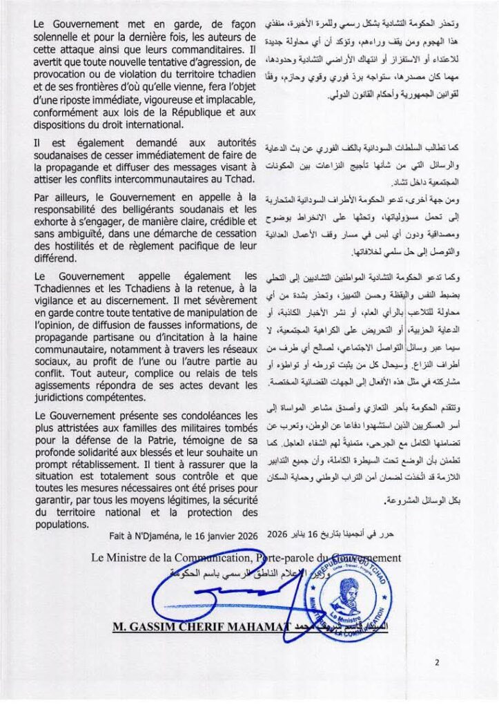 وجّهت الحكومة التشادية تحذيرًا رسميًا ونهائيًا إلى المجموعات المسلحة التي تنطلق من الأراضي السودانية، وكذلك إلى الجهات التي تقدم لها الدعم، مؤكدة أن أي محاولة جديدة لانتهاك السيادة الوطنية أو استفزاز القوات التشادية ستُقابل برد فوري، قوي وحازم، وفقًا لقوانين الجمهورية وأحكام القانون الدولي.