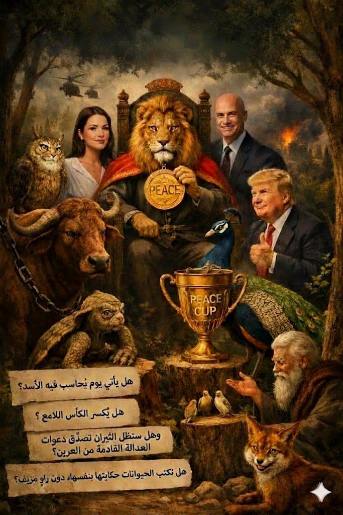 حين ارتفع صراخ الغابة من الدم والخراب، قرر الأسد ألا يخرج بمخالبه العارية، بل بنداءٍ عن «السلام». جمع الحيوانات، رفع وسامًا ذهبيًا، وقال: «هذا لمن يخدم الاستقرار».