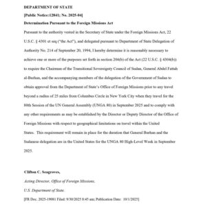تحت سلطة قانون البعثات الأجنبية (Foreign Missions Act) والمفوّضية الصادرة عن وزارة الخارجية الأمريكية، تقرر أنه من الضروري إلزام رئيس مجلس السيادة الانتقالي في السودان، الفريق عبد الفتاح البرهان، وأعضاء الوفد المرافق له من الحكومة السودانية، بالحصول على موافقة مسبقة من مكتب البعثات الأجنبية التابع لوزارة الخارجية الأمريكية قبل القيام بأي سفر خارج دائرة نصف قطرها 25 ميلاً من “كولومبوس سيركل” في مدينة نيويورك.