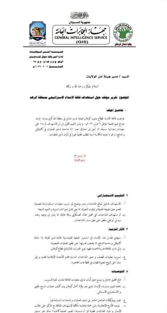 وذكرت تقارير منشورة على موقع مجلة الدفاع البريطانية ومنصة الاستخبارات ونقلها موقع ذا ستاندرد – كينيا بتاريخ 10 فبراير 2026، أن القافلة التي وُصفت رسميًا بأنها مساعدات إنسانية في جنوب كردفان قد تحتوي، وفق السجلات الداخلية، على معدات عسكرية.